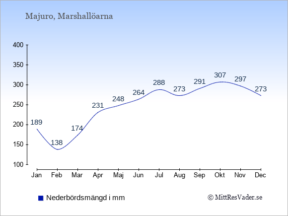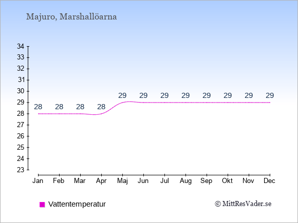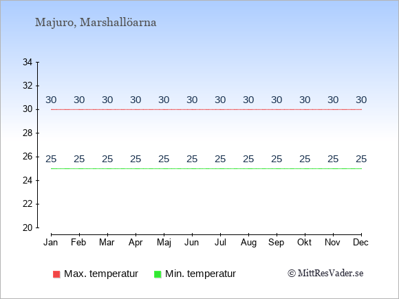 Normalt ligger temperaturen på Marshallöarna (Majuro) därför i en viss månad i intervallet mellan den genomsnittligt högsta och lägsta temperatur. I juli är det till exempel oftast upp till ca. 30 grader under dagen