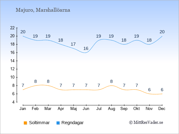 Grafen visar det genomsnittliga antalet soltimmar på Marshallöarna under en viss månad (soltimmar är det antalet timmar per dag där solen skinnar), och antalet regndagar (dvs. det genomsnittliga antalet dagar