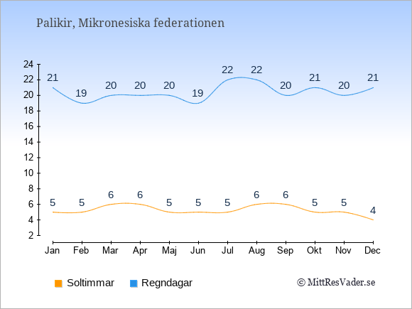 Grafen visar det genomsnittliga antalet soltimmar i Mikronesiska federationen under en viss månad (soltimmar är det antalet timmar per dag där solen skinnar), och antalet regndagar (dvs. det genomsnittliga antalet dagar