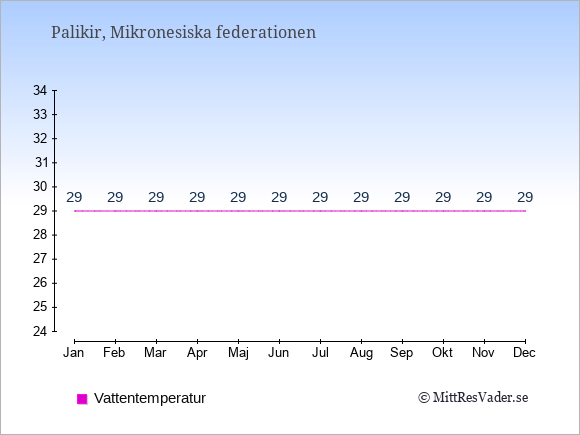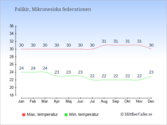 Normalt ligger temperaturen i Mikronesiska federationen (Palikir) därför i en viss månad i intervallet mellan den genomsnittligt högsta och lägsta temperatur. I juli är det till exempel oftast upp till ca. 30 grader under dagen
