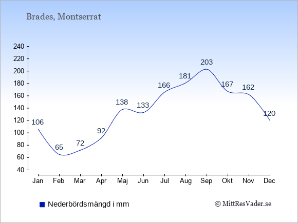 För att se hur vädret på Montserrat skiljer sig från vädret hemma, kan du också jämföra siffrorna måned för måned med motsvarande siffror för Sverige under samma period här: Montserrats klimat.
