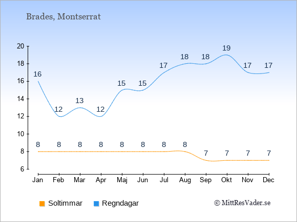 Grafen visar det genomsnittliga antalet soltimmar på Montserrat under en viss månad (soltimmar är det antalet timmar per dag där solen skinnar), och antalet regndagar (dvs. det genomsnittliga antalet dagar