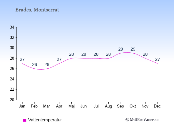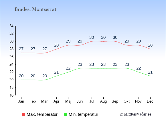 Normalt ligger temperaturen på Montserrat (Brades) därför i en viss månad i intervallet mellan den genomsnittligt högsta och lägsta temperatur. I juli är det till exempel oftast upp till ca. 30 grader under dagen