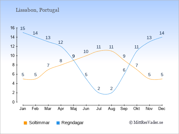 Grafen visar det genomsnittliga antalet soltimmar i Portugal under en viss månad (soltimmar är det antalet timmar per dag där solen skinnar), och antalet regndagar (dvs. det genomsnittliga antalet dagar