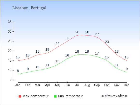 Normalt ligger temperaturen i Portugal (Lissabon) därför i en viss månad i intervallet mellan den genomsnittligt högsta och lägsta temperatur. I juli är det till exempel oftast upp till ca. 28 grader under dagen