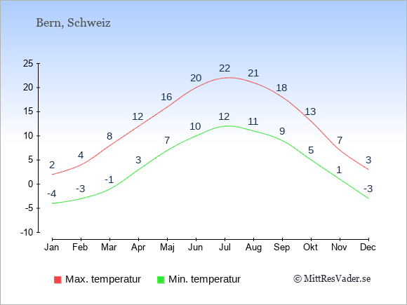 Normalt ligger temperaturen i Schweiz (Bern) därför i en viss månad i intervallet mellan den genomsnittligt högsta och lägsta temperatur. I juli är det till exempel oftast upp till ca. 22 grader under dagen
