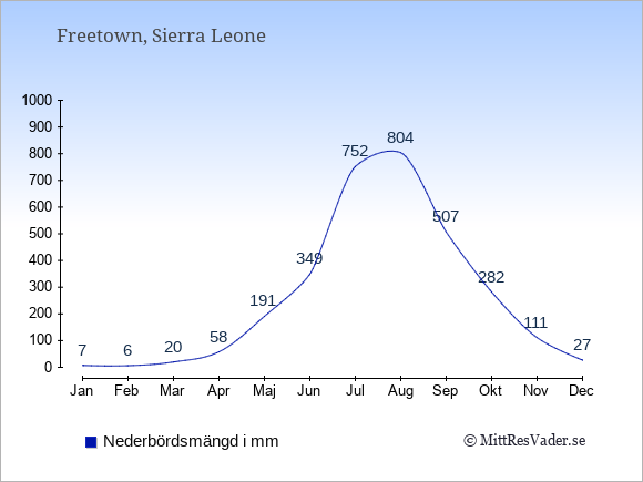 För att se hur vädret i Sierra Leone skiljer sig från vädret hemma, kan du också jämföra siffrorna måned för måned med motsvarande siffror för Sverige under samma period här: Sierra Leones klimat.