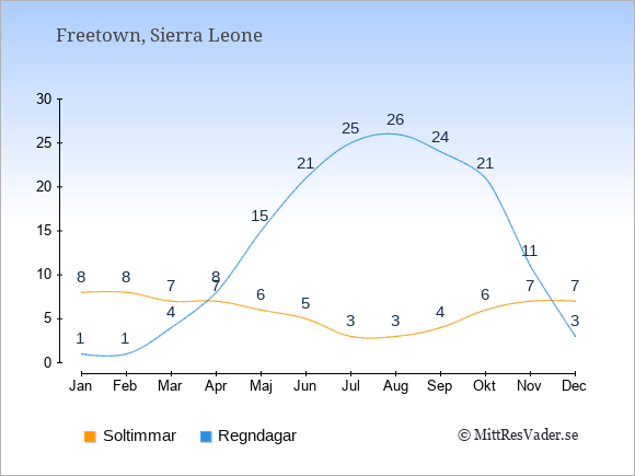 Grafen visar det genomsnittliga antalet soltimmar i Sierra Leone under en viss månad (soltimmar är det antalet timmar per dag där solen skinnar), och antalet regndagar (dvs. det genomsnittliga antalet dagar