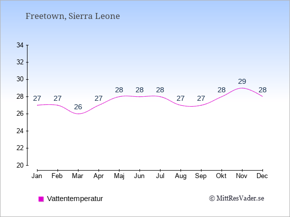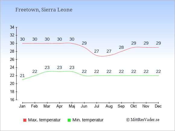 Normalt ligger temperaturen i Sierra Leone (Freetown) därför i en viss månad i intervallet mellan den genomsnittligt högsta och lägsta temperatur. I juli är det till exempel oftast upp till ca. 27 grader under dagen