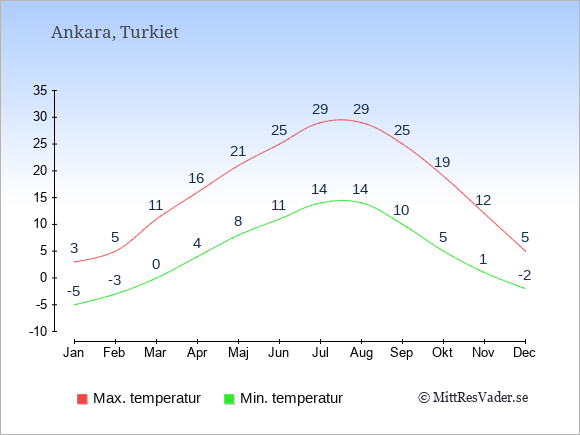 Normalt ligger temperaturen i Turkiet (Ankara) därför i en viss månad i intervallet mellan den genomsnittligt högsta och lägsta temperatur. I juli är det till exempel oftast upp till ca. 29 grader under dagen