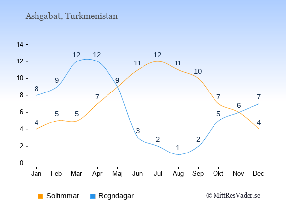 Grafen visar det genomsnittliga antalet soltimmar i Turkmenistan under en viss månad (soltimmar är det antalet timmar per dag där solen skinnar), och antalet regndagar (dvs. det genomsnittliga antalet dagar