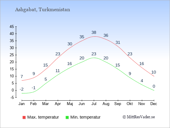 Normalt ligger temperaturen i Turkmenistan (Ashgabat) därför i en viss månad i intervallet mellan den genomsnittligt högsta och lägsta temperatur. I juli är det till exempel oftast upp till ca. 38 grader under dagen
