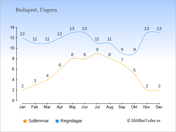 Grafen visar det genomsnittliga antalet soltimmar i Ungern under en viss månad (soltimmar är det antalet timmar per dag där solen skinnar), och antalet regndagar (dvs. det genomsnittliga antalet dagar