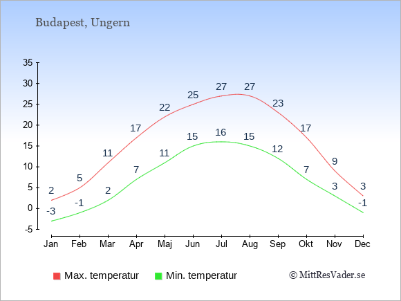 Normalt ligger temperaturen i Ungern (Budapest) därför i en viss månad i intervallet mellan den genomsnittligt högsta och lägsta temperatur. I juli är det till exempel oftast upp till ca. 27 grader under dagen