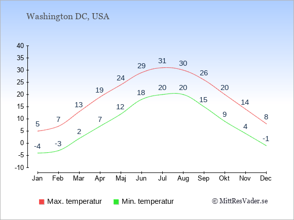 Normalt ligger temperaturen i USA (Washington DC) därför i en viss månad i intervallet mellan den genomsnittligt högsta och lägsta temperatur. I juli är det till exempel oftast upp till ca. 31 grader under dagen