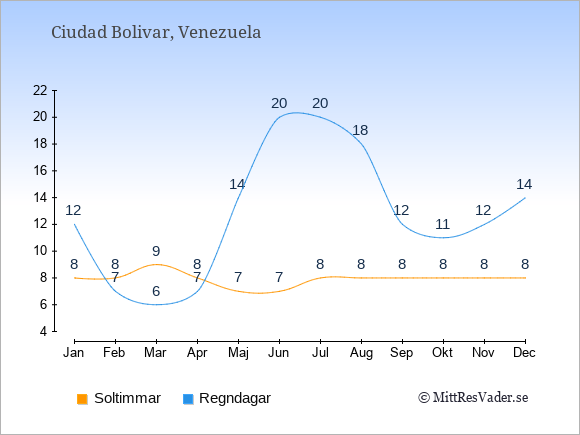 Graferna visar det genomsnittliga antalet soltimmar i Ciudad Bolivar per dag
