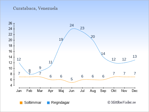 Grafen visar det genomsnittliga antalet soltimmar i Curatabaca under en viss månad (soltimmar är det antalet timmar per dag där solen skinnar), och antalet regndagar (dvs. det genomsnittliga antalet dagar