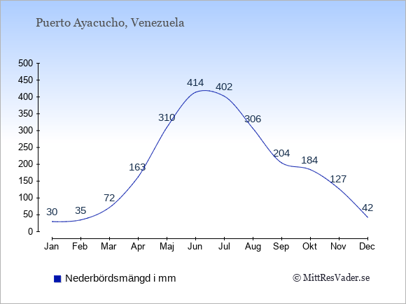 För att se hur vädret i Puerto Ayacucho skiljer sig från vädret hemma, kan du också jämföra siffrorna måned för måned med motsvarande siffror för Sverige under samma period här: Puerto Ayacuchos klimat.