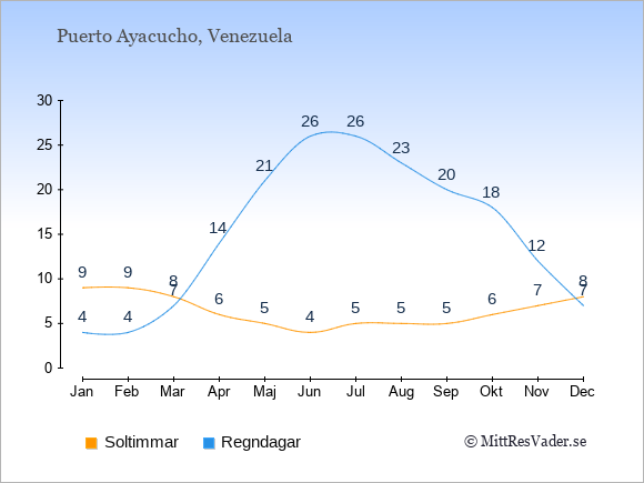 Grafen visar det genomsnittliga antalet soltimmar i Puerto Ayacucho under en viss månad (soltimmar är det antalet timmar per dag där solen skinnar), och antalet regndagar (dvs. det genomsnittliga antalet dagar