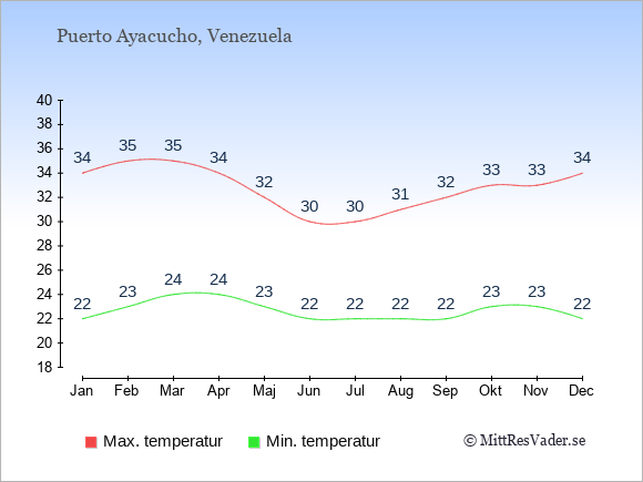Grafen visar de genomsnittligt högsta temperaturerna i Puerto Ayacucho (vanligtvis det värde som uppmätts mitt på dagen) och de genomsnittligt lägsta temperaturer (vanligtvis tidpunkten just innan soluppgång).