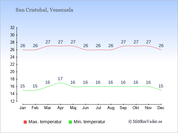 Grafen visar de genomsnittligt högsta temperaturerna i San Cristobal (vanligtvis det värde som uppmätts mitt på dagen) och de genomsnittligt lägsta temperaturer (vanligtvis tidpunkten just innan soluppgång).