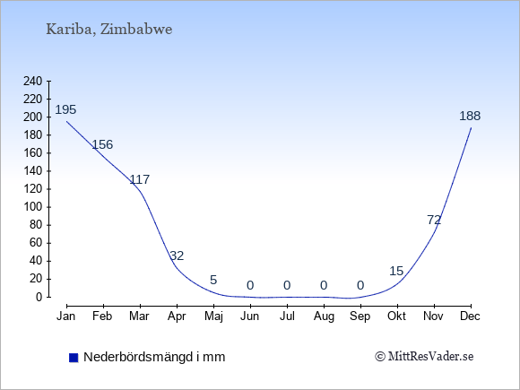 För att se hur vädret i Kariba skiljer sig från vädret hemma, kan du också jämföra siffrorna måned för måned med motsvarande siffror för Sverige under samma period här: Karibas klimat.