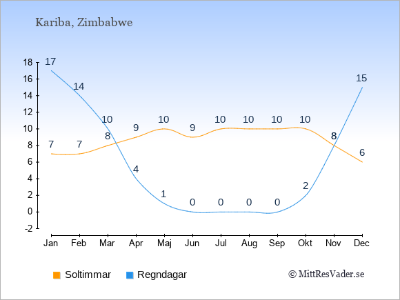 Grafen visar det genomsnittliga antalet soltimmar i Kariba under en viss månad (soltimmar är det antalet timmar per dag där solen skinnar), och antalet regndagar (dvs. det genomsnittliga antalet dagar