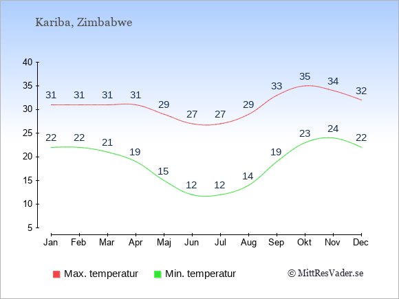 Grafen visar de genomsnittligt högsta temperaturerna i Kariba (vanligtvis det värde som uppmätts mitt på dagen) och de genomsnittligt lägsta temperaturer (vanligtvis tidpunkten just innan soluppgång).